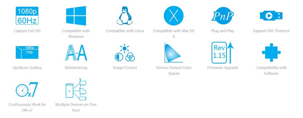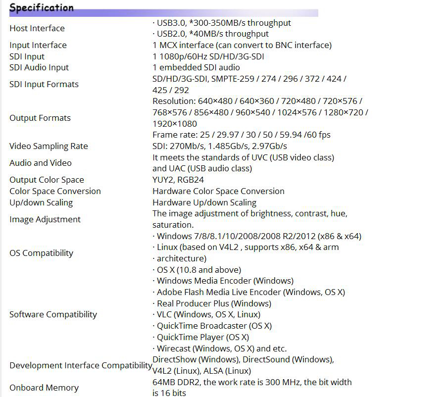 USB 3.0 interface is used and is also compatible with USB 2.0. Compatible operating systems: Windows (7, 8, 8.1), Linux (kernel version 2.6.38 and above), OS X (10.8 and above). Compatible with various software with DirectShow architecture.