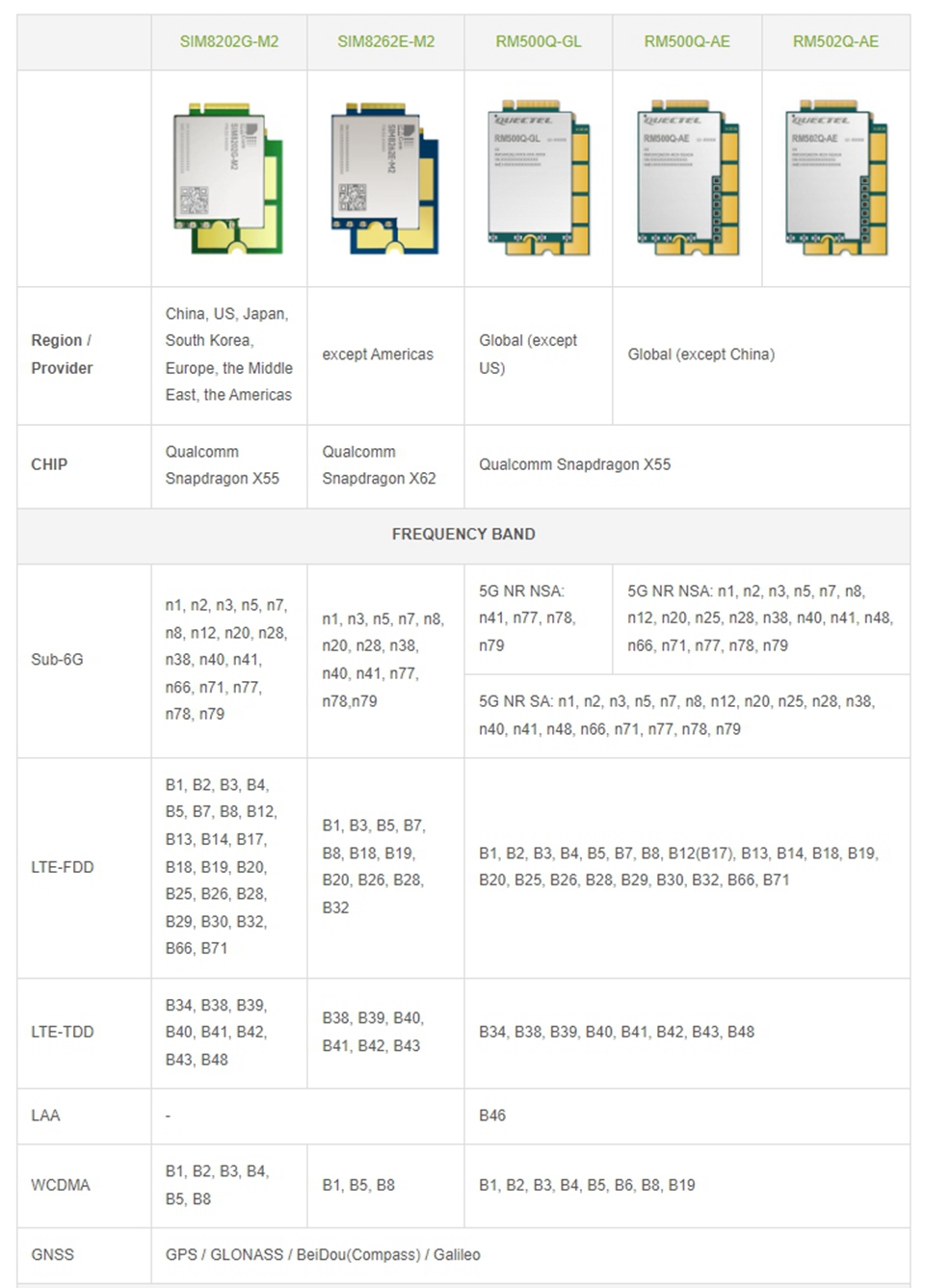 - Support 5G modules with 3042/3052 form factor, such as SIM82XX, and RM50XQ series 5G modules