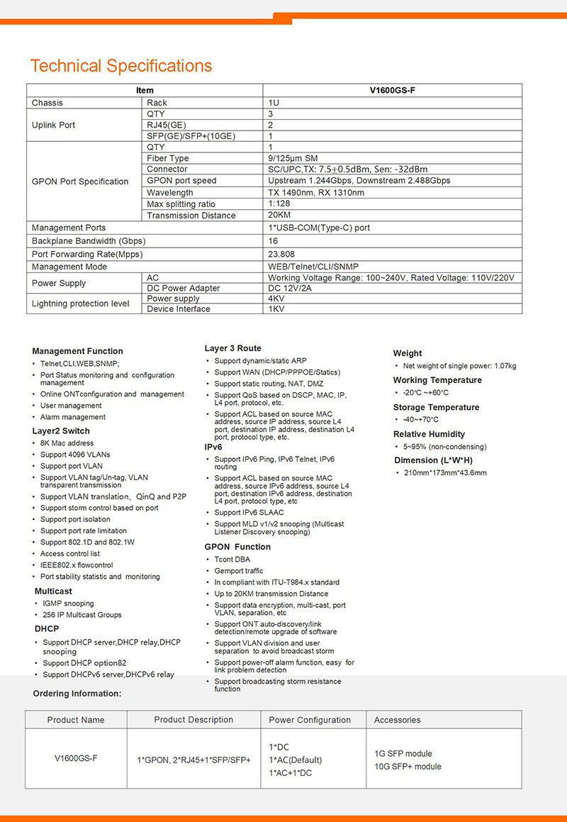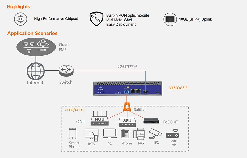 V1600GS-F is a box-type GPON OLT with one PON port. The price of V1600GS-F is very attractive and the performance is very strong. The splitting ratio of its PON port is 1:128, and the farthest transmission distance is 20KM. Its uplink and downlink bandwidth is as high as: 1.25Gbps/2.5Gbps. V1600GS-F can be widely used in FTTH, SOHO, small business office and other application scenarios.