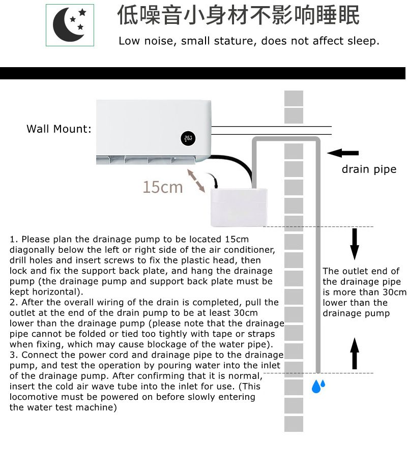 3. Insert the drainage pipe of the air conditioner into the inlet of the drainage pump. The outlet of the drainage pump can be connected with a Φ6mm x Φ9mm (inner diameter x outer diameter) water pipe, and fixed with the self-locking tie of the accessory package. Arrange the water pipe of the outlet, and then hang the drainage pump on the mounting plate on the wall.