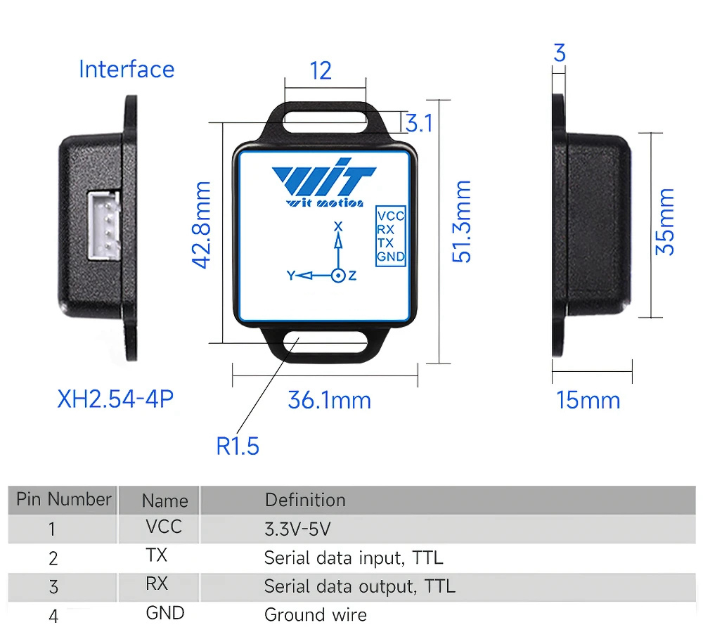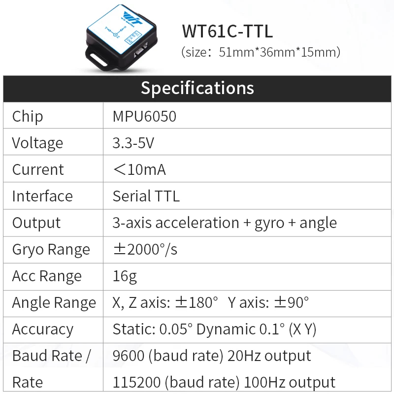 WT61C-TTL is a 6 axis gyroscope sensor. It supports TTL serial communication. And the communication distance is 1m/3.3ft.