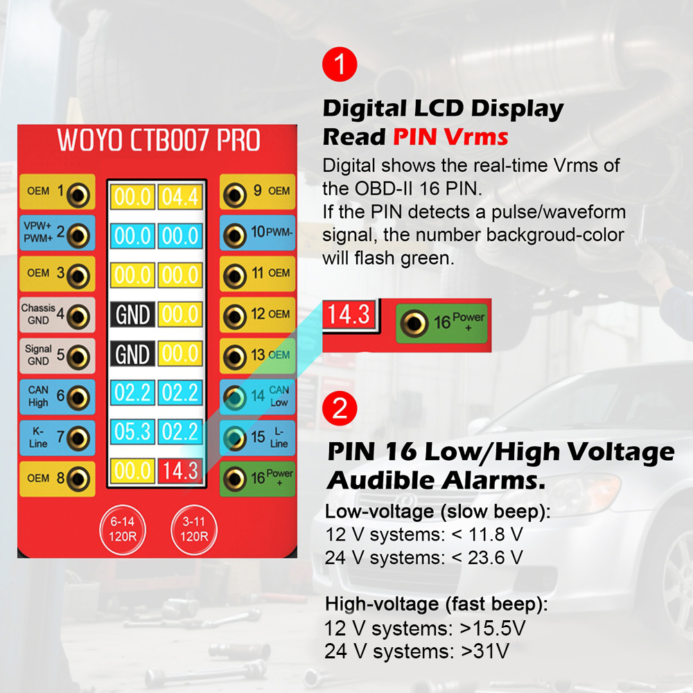 - A professional 12V/24V circuit-test and signal-access tool for diagnostics, development, and bench testing. It exposes every OBD-II pin, monitors live voltages (true RMS), provides optional CAN termination, and supports safe, fast hookup of other diagnostic/programming devices.