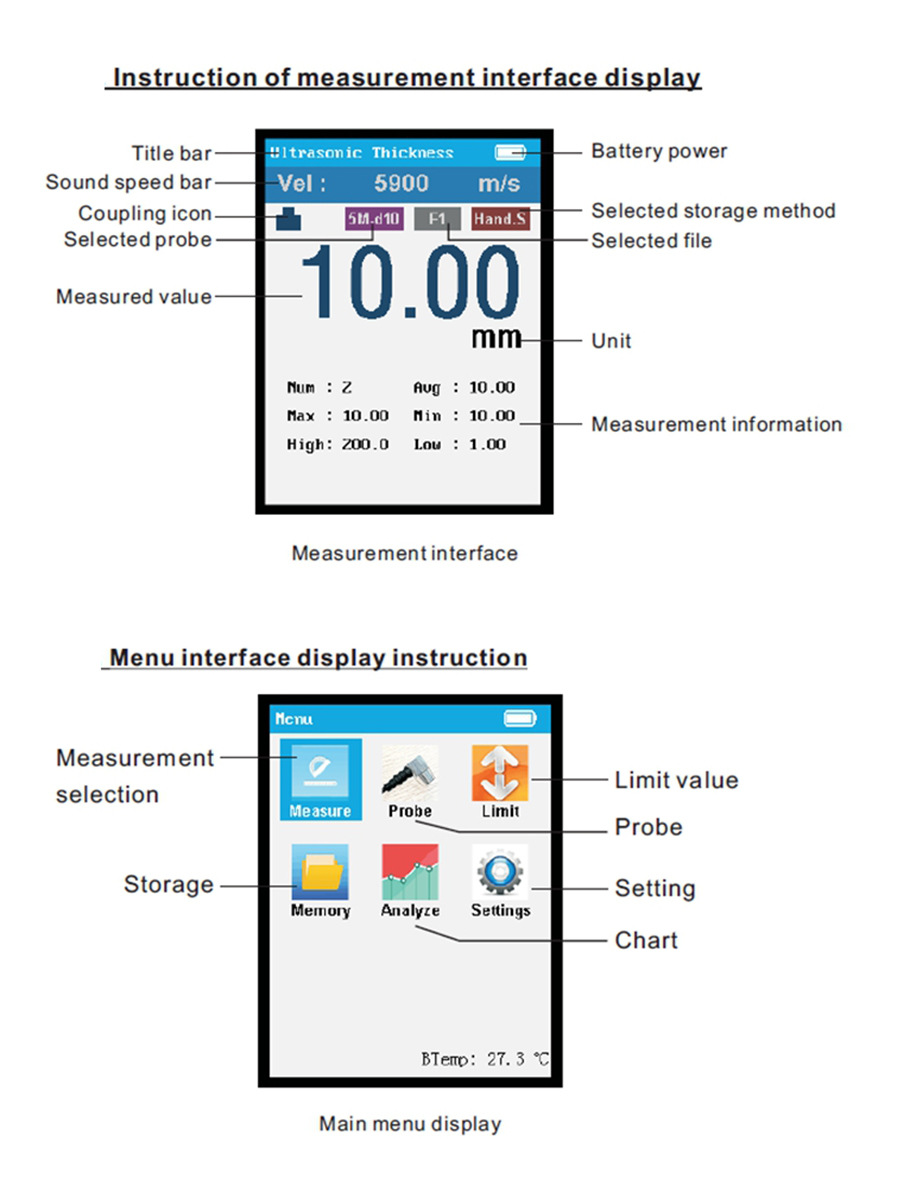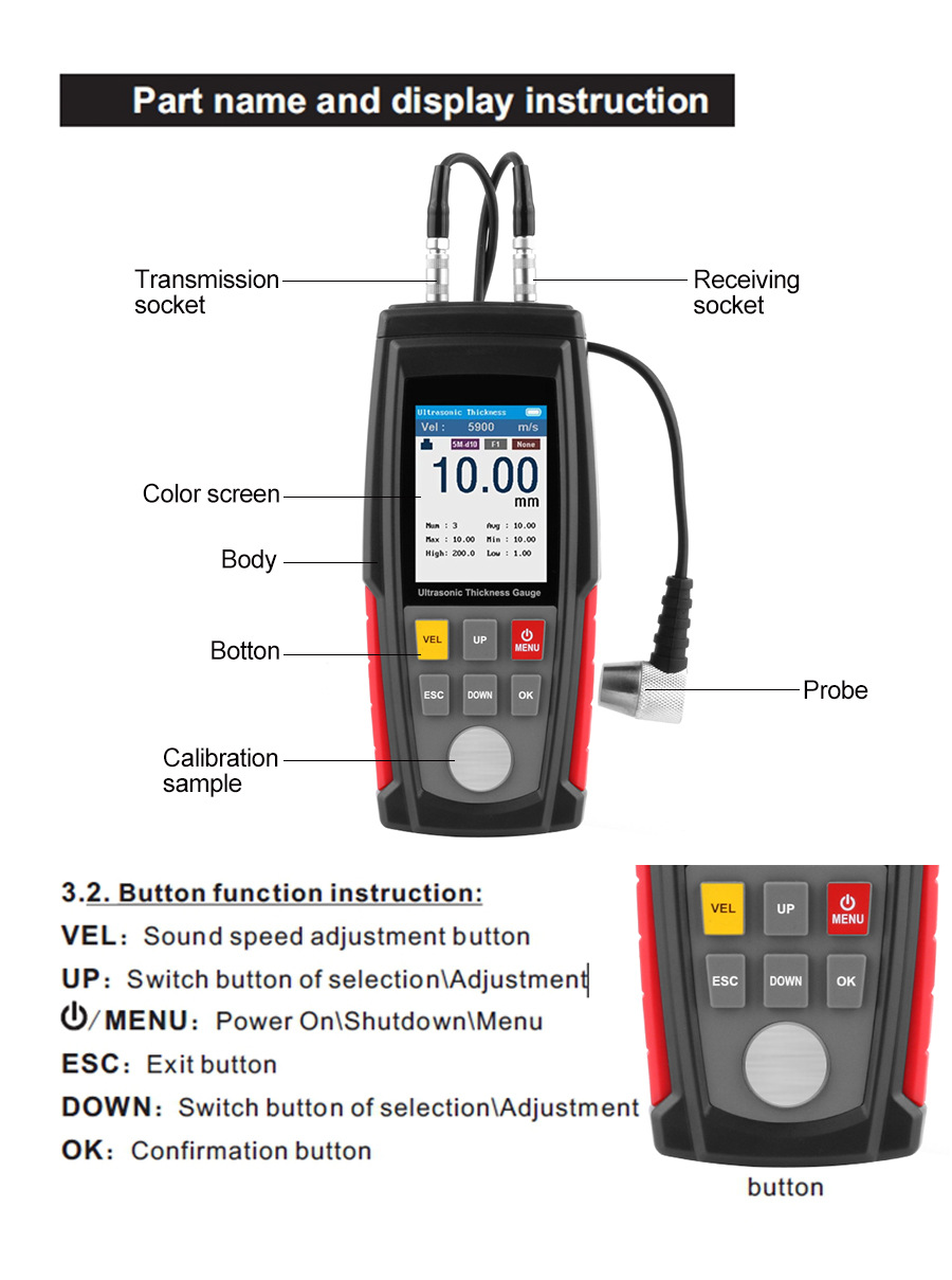 - Wide application: The ultrasonic thickness gauge is suitable for the material that conduct and reflect constant sonic , such as metal, plastic, ceramic, glass, etc.