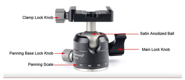 XB-28 Low-Profile Ball Head is suitable for Arca-type, and it has a load capacity of 9.9 lb, which is suitable for point-and-shoot and mirror-less cameras. Also, the ball head is ideal to use together with tabletop and small tripods because of its compact 2.6" in height and minimal weight of 0.4 lb. Furthermore, the main locking knob is located off to the side of the ball head instead of on the bottom, which lowers the center of gravity on the head. Also, the main knob has a ratchet feature that pulls out and repositions to gain better leverage for locking and unlocking the knob. Additionally, the head rotates a full 360° by unlocking the independent pan lock, and the CNC-machined aluminum has been anodized with a durable satin finish.