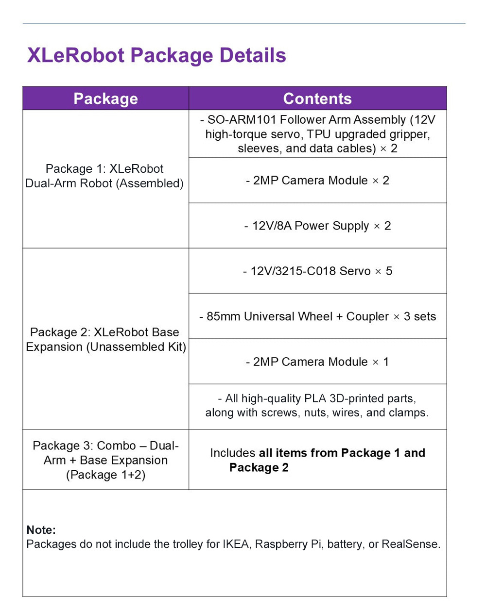 This set does not include a battery. It is recommended to purchase a commonly available high-power portable charger or power bank that supports at least two Type-C ports (each supporting 65W fast charging) with a total power output of 140W or more. For the cart, it is recommended to directly purchase the original Raskog cart from IKEA (large version) to ensure compatibility with XLeRobot hardware.