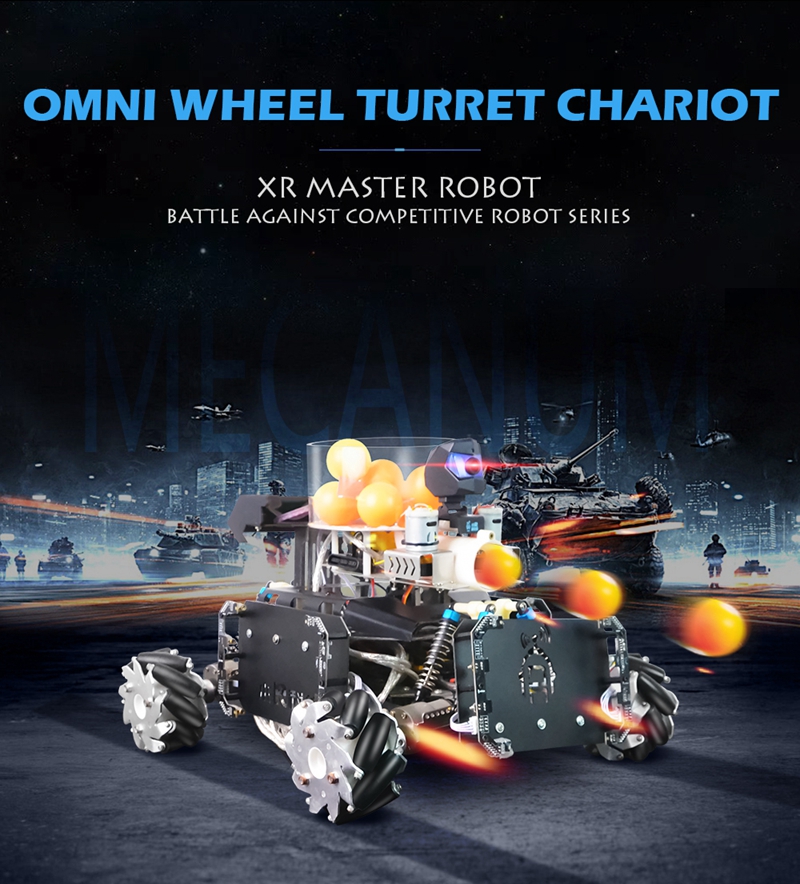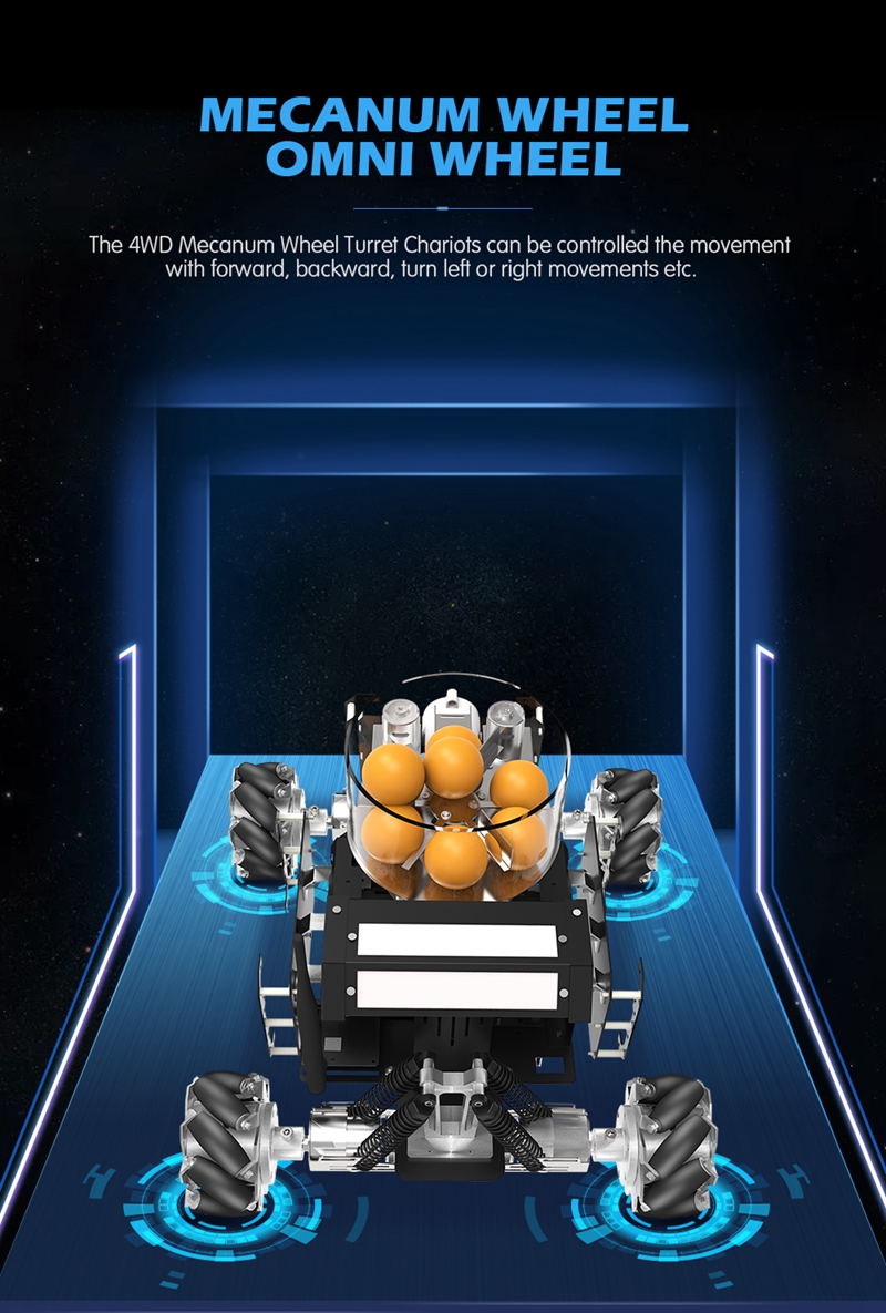 The 4WD Mecanum Wheel Turret Chariots can be controlled the movement with forward, backward, turn left or right movements etc.