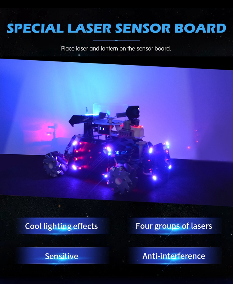 The laser sensor board features four sets of lasers and some colored lights for cool lighting effects while being sensitive and anti-jamming.