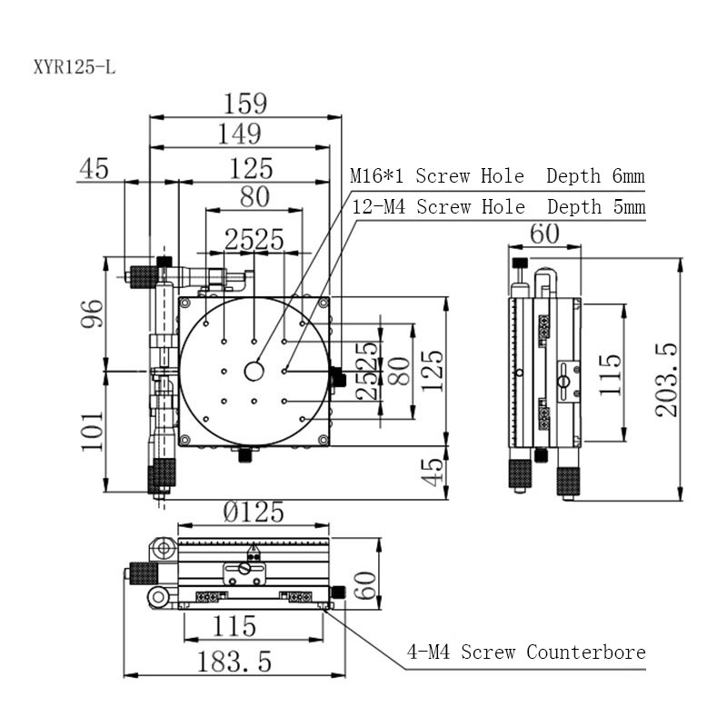 - Travel: XY Axis: ±12.5mm; R Axis: Coarse Adjustment 360° Rotation, Fine Adjustment ±10°