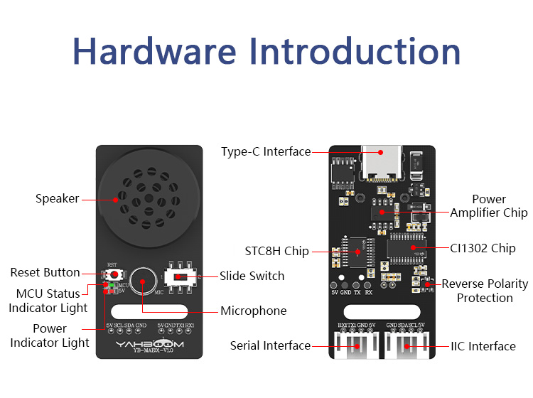* Easy to Use: Users issue voice commands, which the voice module recognizes and sends to the mainboard. The mainboard then directly executes the corresponding action and drives the voice module to complete broadcast. The entire process is simple and user-friendly.