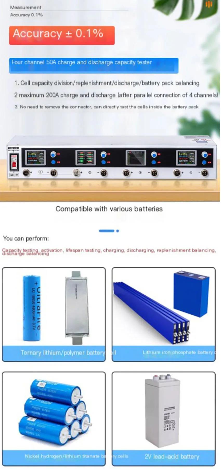 - Four channel 50A charging and discharging capacity tester