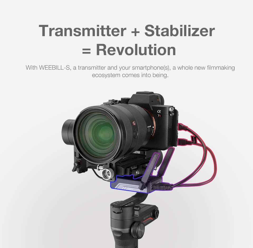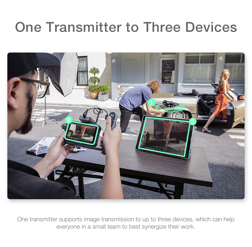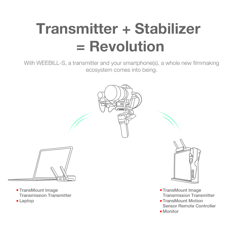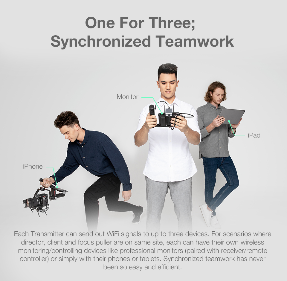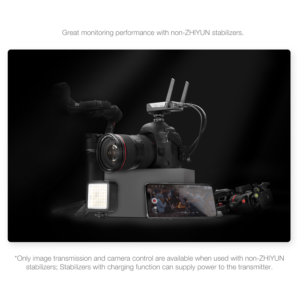 -When mounted with image transmission receiver and transmitter, up to 3 devices can be connected to your stabilizer, including not only smartphones and iPad, but also professional monitors.